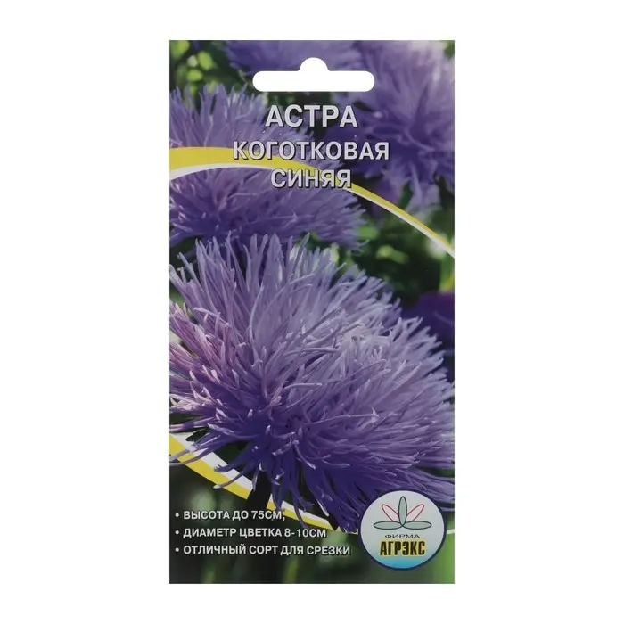 Превосходная астра для срезки! Куст узкий, букетной формы, прочный, высотой 75 см. На растении 12-15 махровых соцветий, диаметром 8-10 см. Окраска синяя. Изогнутые внутрь и закрученные лепестки придают соцветию характерную коготковую форму. Цветение август-сентябрь. Используют для посадки в сборные цветники группами, на рабатки- рядами и на срезку. Растение предпочитает открытое солнечное место, но выносит и полутень. Лучше растет на легких, плодородных почвах. Не переносит внесения органических удобрений в год посадки. Семена высевают с середины февраля по апрель. Глубина заделки семян 0,5 см. При температуре почвы +20°C всходы появляются на 7-14 день. Через 3-4 недели посевы пикируют и выращивают при температуре +12-15°C. В грунт рассаду высаживают во второй половине мая, выдерживая расстояние между растениями 20-30 см.