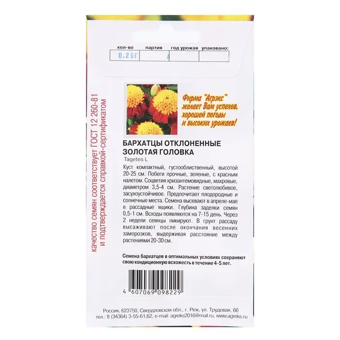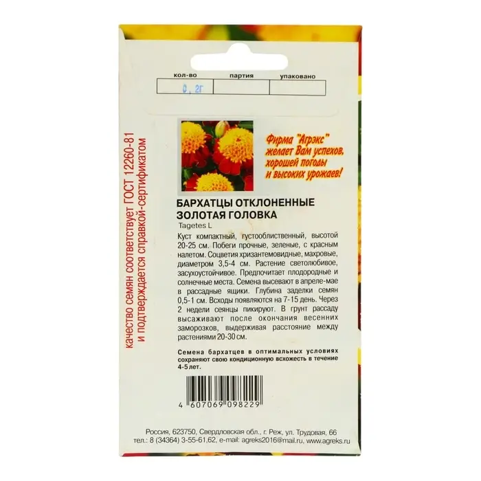 Семена Цветов однолетние Бархатцы "Золотая головка", отклонённые, махровые, 0,2 г