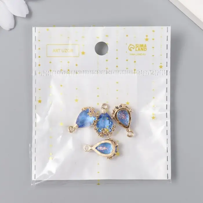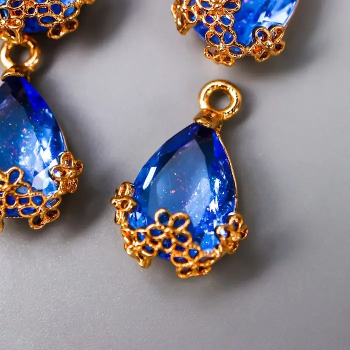 Декор для творчества пластик "Капля с золотыми цветочками" синий кристалл 2х1,2 см