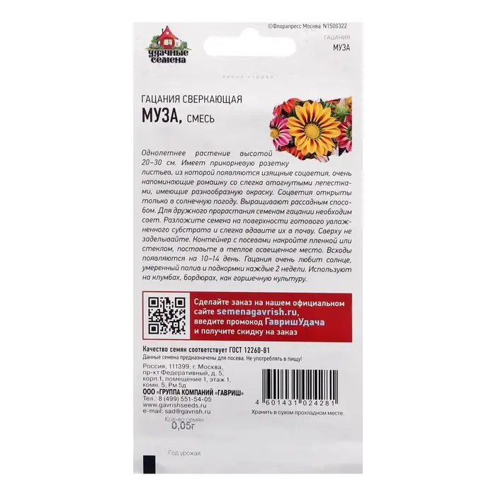 Семена Гацания "Муза", ц/п, крупноцветковая, смесь, 0,05 г