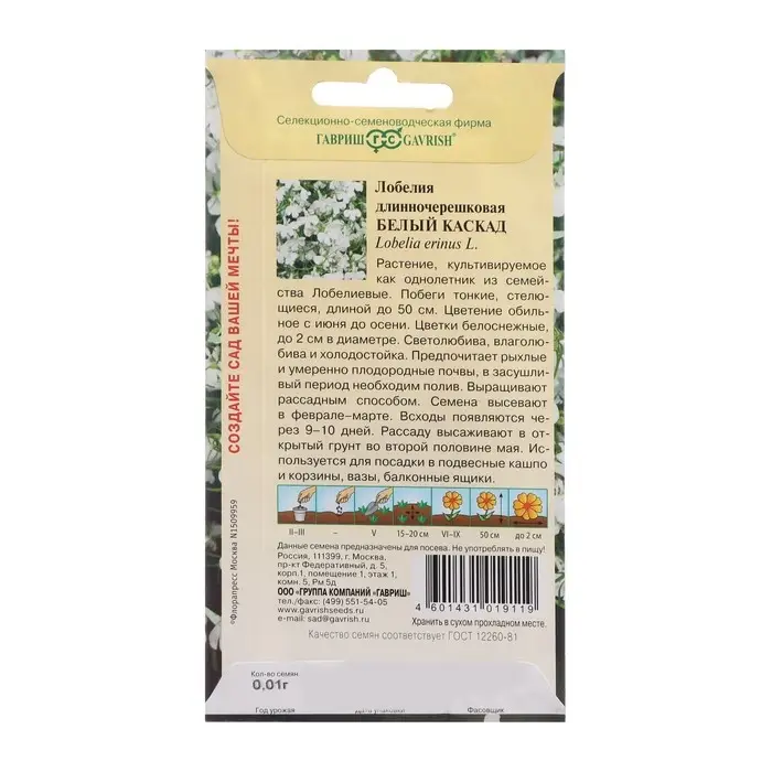 Семена цветов Лобелия ампельная "Белый каскад", ц/п, 0,01 г