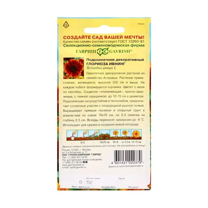 Семена цветов Подсолнечник декоративный "Глориоза Ивнинг", ц/п, 0,5 г