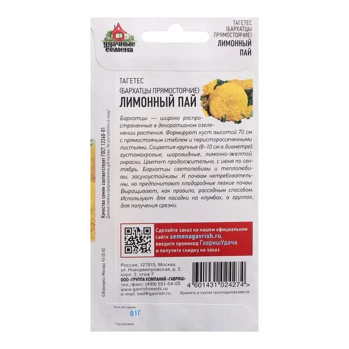 Семена Бархатцы прямые (Тагетес) "Лимонный пай", ц/п, 0,1 г