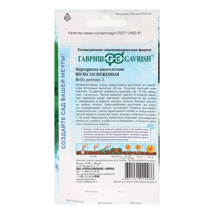 Семена цветов Маргаритка "Весна заснеженная", ц/п, 0,02 г
