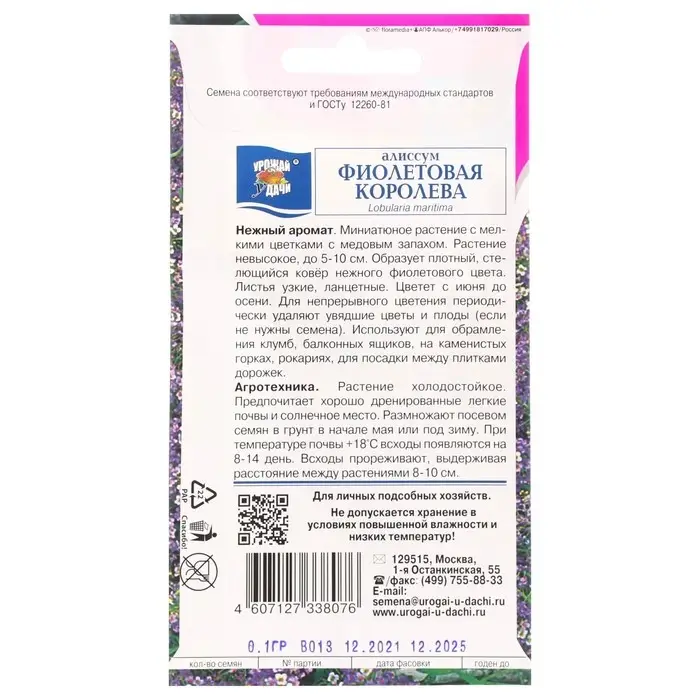 Семена цветов Алиссум "Фиолетовая королева", 0,1 г