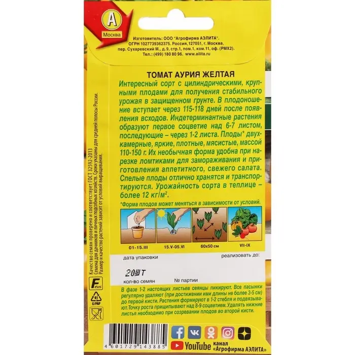 Семена Томат "Аурия желтая", ц/п, 20 шт