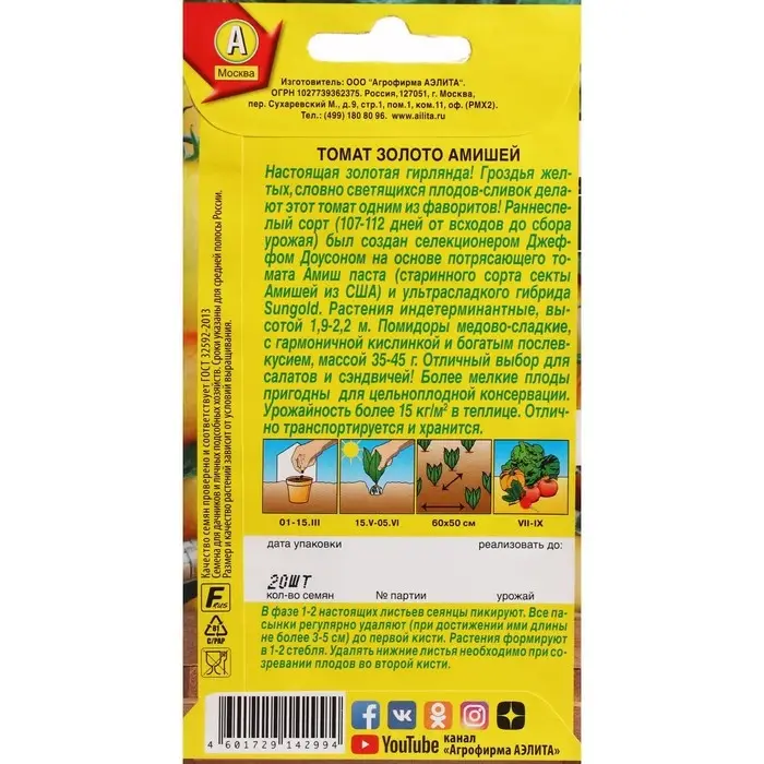 Семена Томат "Золото Амишей", ц/п, 20 шт
