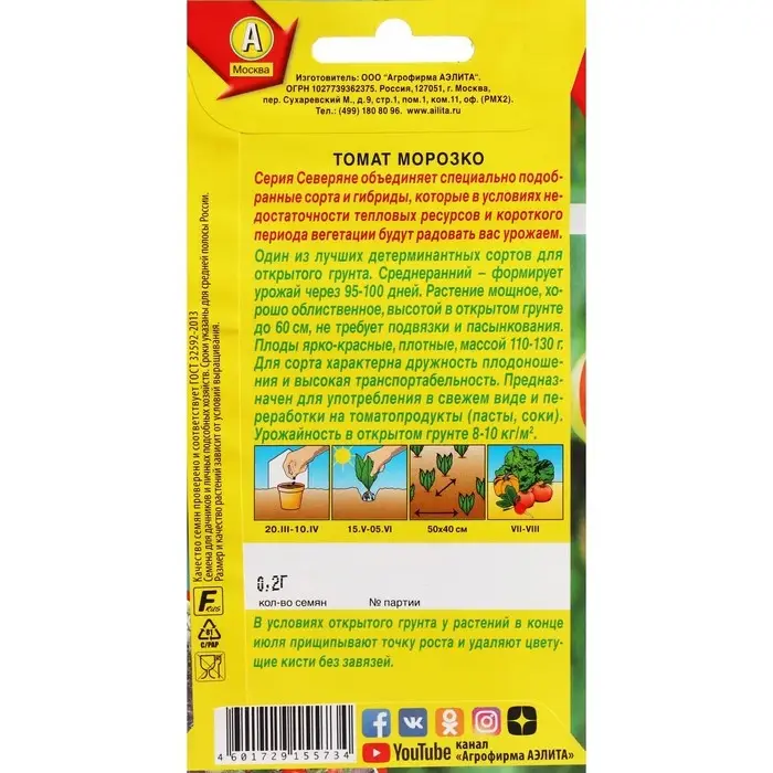 Растение малооблиственное, высотой 100-110 см, имеет 6-7 кистей, в открытом грунте без подвязки не надо пасынковать.