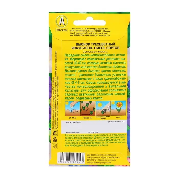 Нарядная смесь неприхотливого летника. Формирует компактные растения высотой 30-40 см, которые активно кустятся, выпуская множество боковых побегов. Вьюнок растет быстро, цветет обильно, пышно – растения буквально усыпаны яркими цветками в виде граммофончиков 4-5 см. Смесь используется в качестве почвопокровной и ампельной культуры для оформления солнечных садовых цветников, балконных контейнеров, подвесных кашпо.