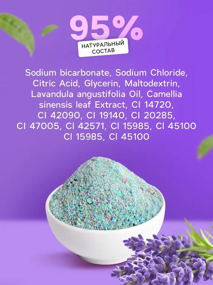 Состав: Sodium bicarbonate, Sodium Chloride, Citric Acid, Glycerin, Maltodextrin, Lavandula angustifolia Оil, Camellia sinensis leaf Extract, CI 14720, CI 42090, CI 19140, CI 20285, CI 47005, Cl 42571, Сl 15985, Сl 45100.