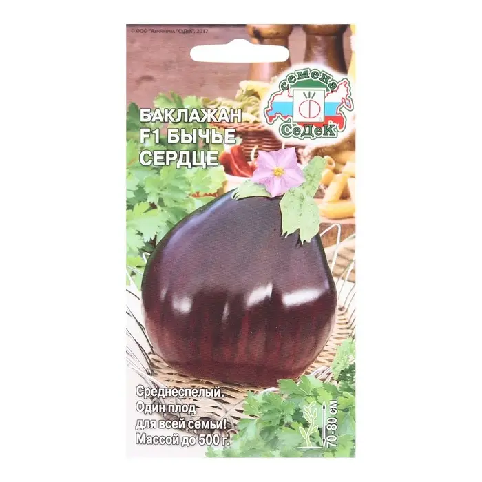 Баклажан Бычье сердце F1 - среднеспелый (110-115 дней) урожайный гибрид. Растение мощное, высотой 70-80 см. Плоды крупные, округло-овальные, темно-фиолетовые, глянцевые, массой 300-500 г и более. Мякоть молочно-белая, плотная, без горечи. Большой размер одного плода позволяет готовить из него блюдо для всей семьи.