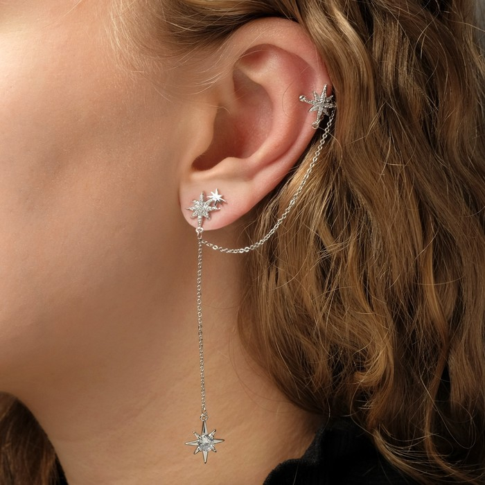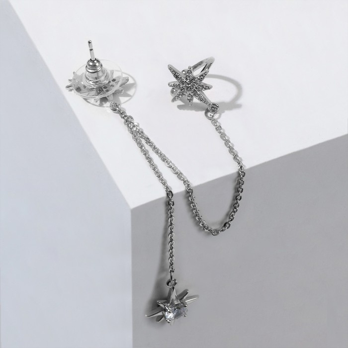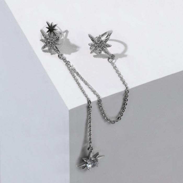Серьга «Кафф» северная звезда с цепью, цвет белый в серебре