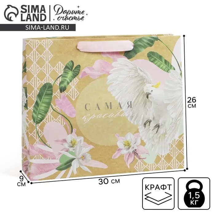 Пакет подарочный крафтовый, упаковка, «Самая красивая», M 30 х 26 х 9 см