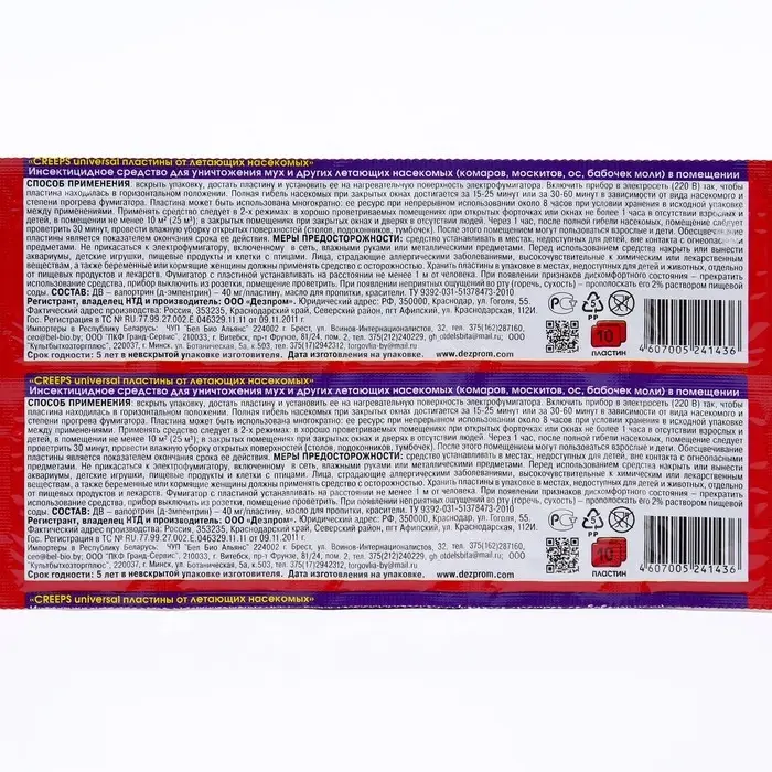 Средство для уничтожения мух, комаров, москитов, ос, бабочек моли для использования с электрофумигатором.Вскрыть упаковку, достать пластину и установить ее на нагревательную поверхность электрофумигатора.Включить прибор в электрическую сеть (220В) так, чтобы пластина находилась в горизонтальном положении. Комары начинают погибать через 10-15 минут после включения фумигатора в сеть, полная гибель наступает через 25-60 минут.Состав: ДВ - вапортрин, масло для пропитки, красители