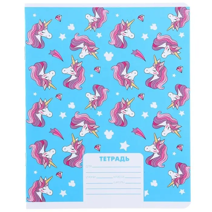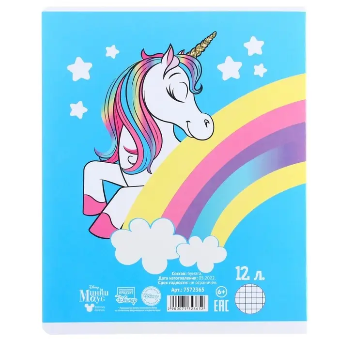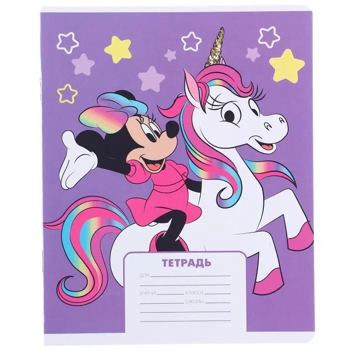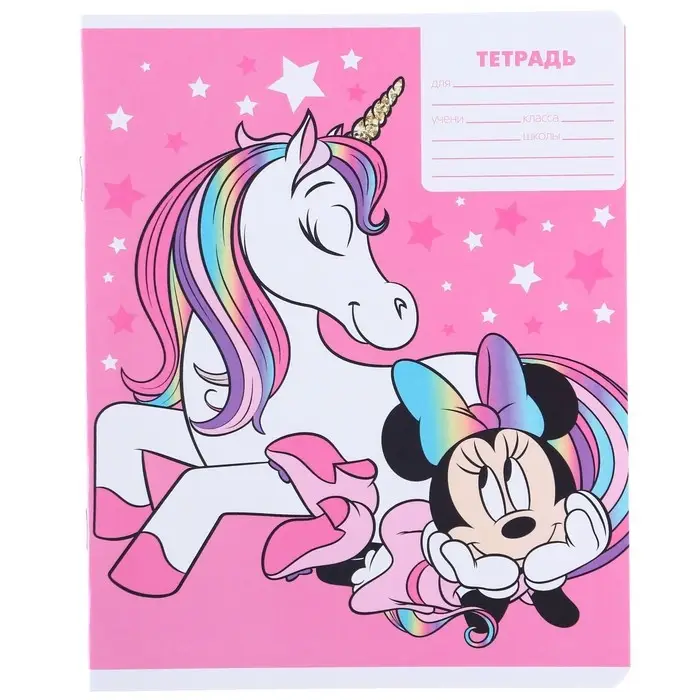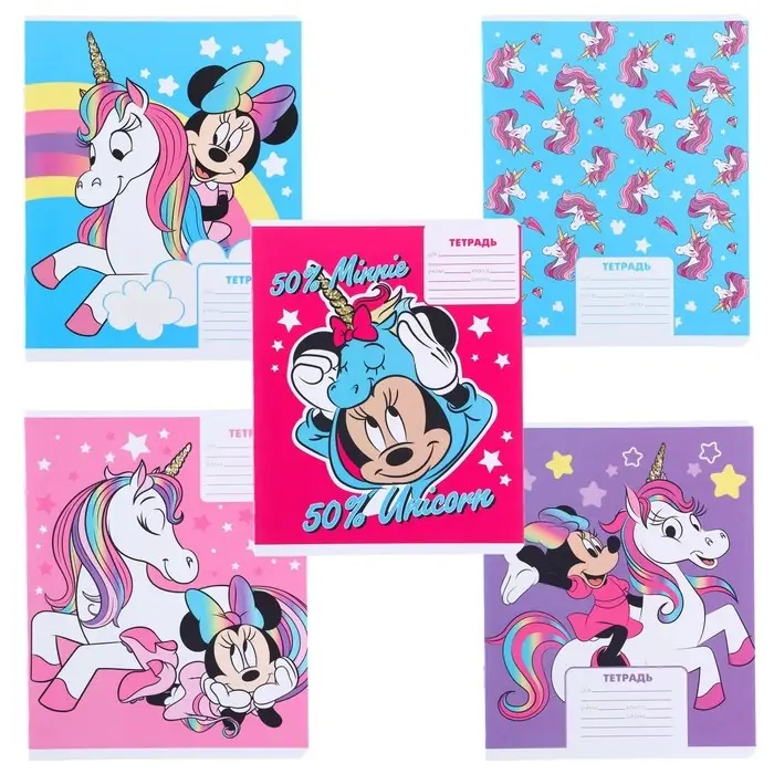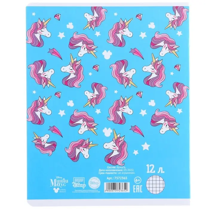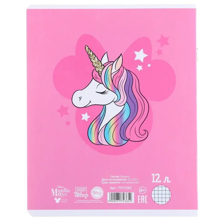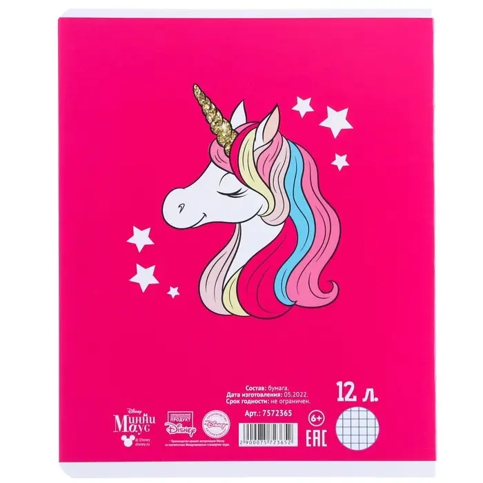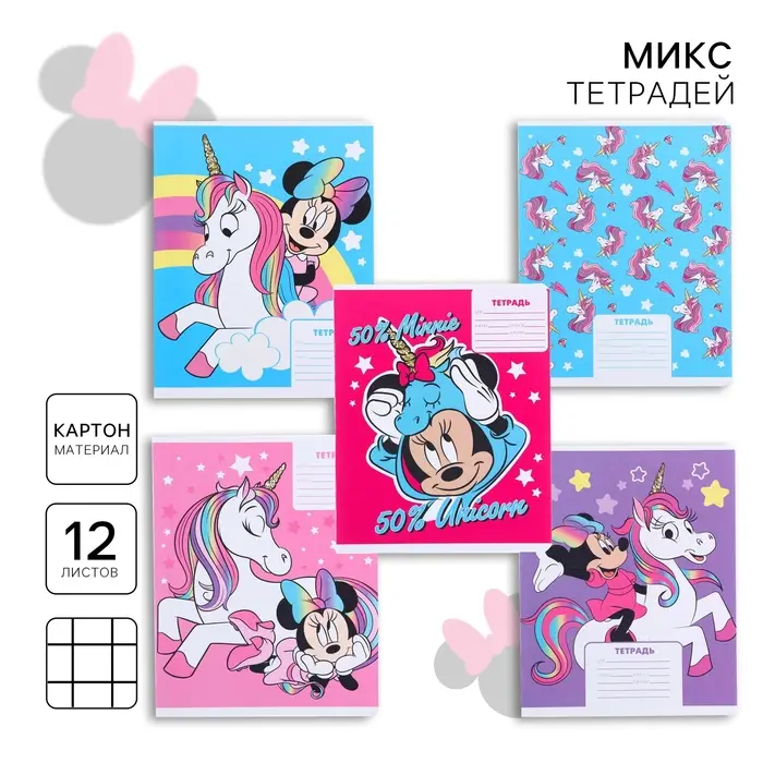 Тетрадь в клетку 12 листов, 5 видов МИКС, обложка мелованный картон, «Минни Маус и единорог»