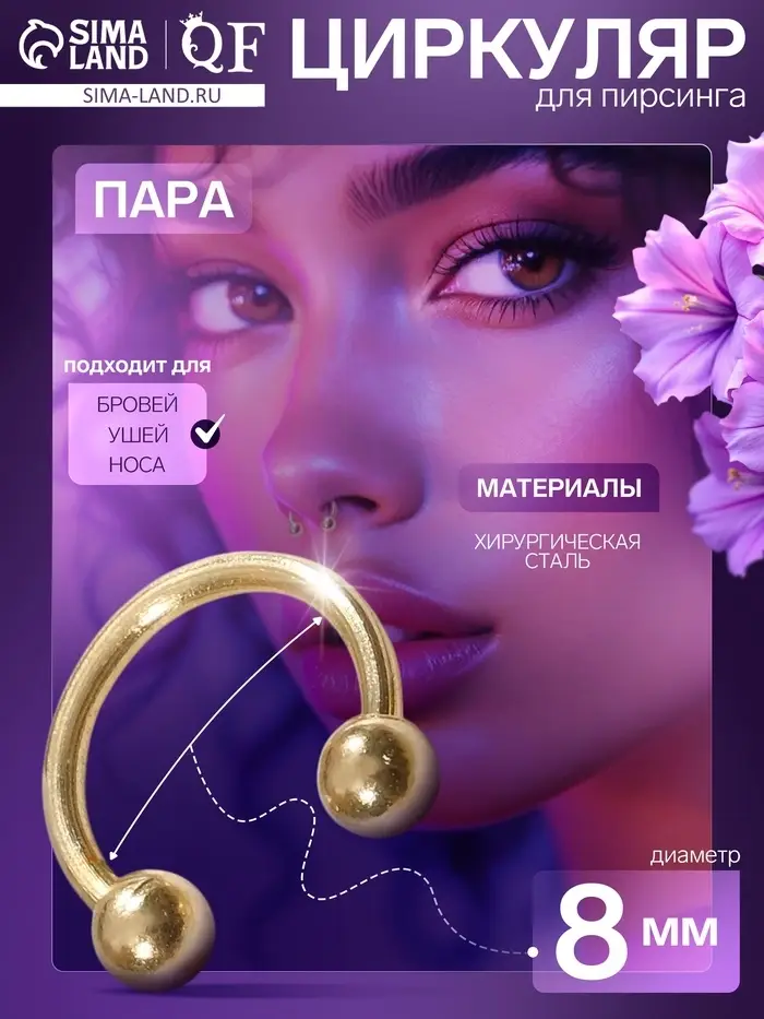 Пирсинг в бровь циркуляр, шар, d=8 мм, пара, цвет золото (неделимая фасовка 12 пар, цена за пару)
