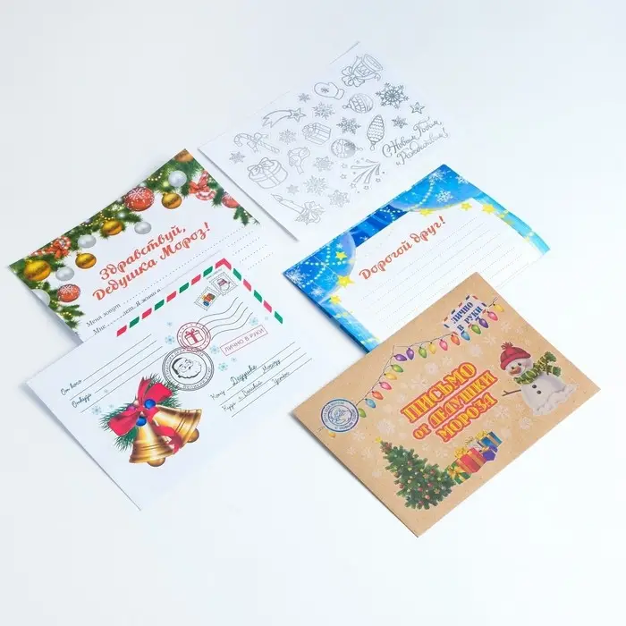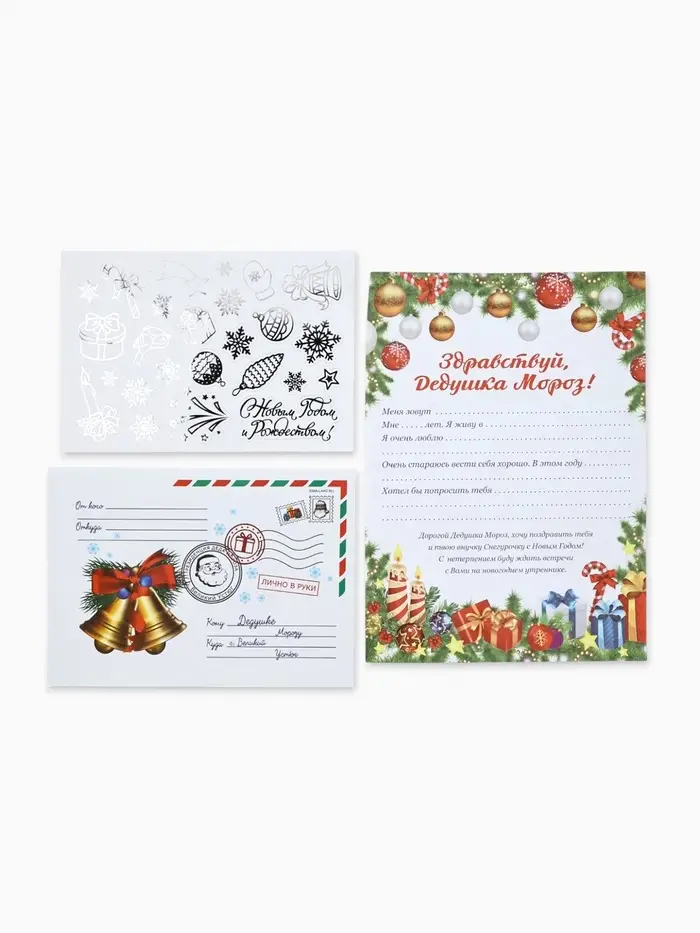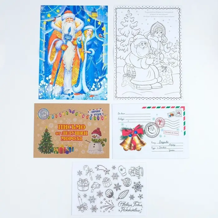 - письмо формата А4 из плотной бумаги с шаблоном для заполнения и красочной картинкой спереди и раскраской сзади,