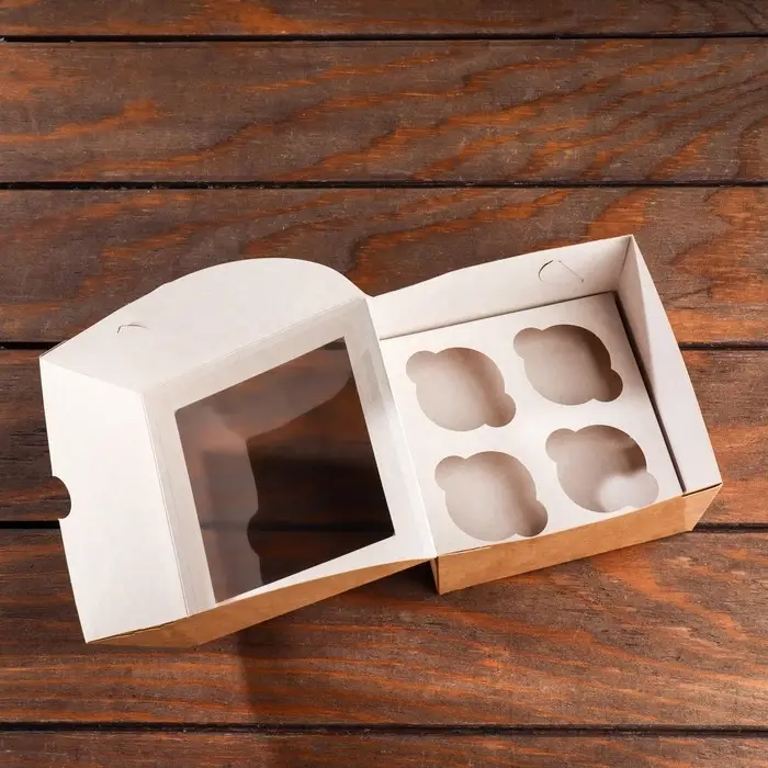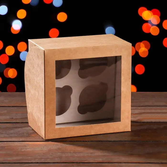 Упаковка на 4 мини - капкейка крафт с окном, 13×13×8 см