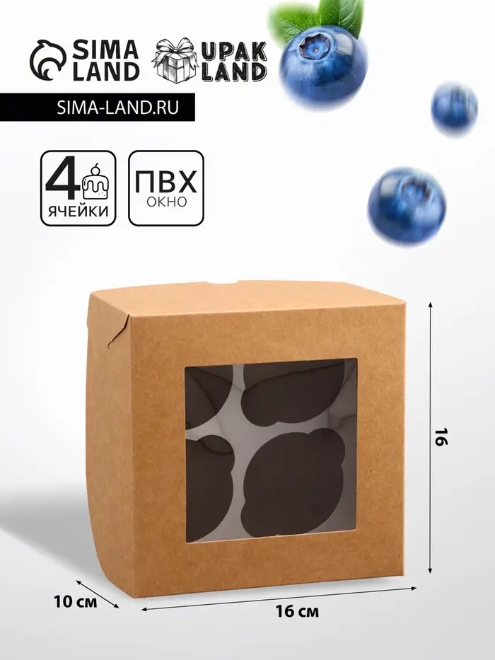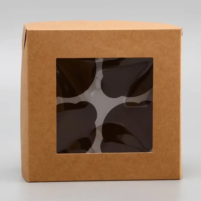 Коробка для 4 капкейка с окном, крафт, 16×16×10 см
