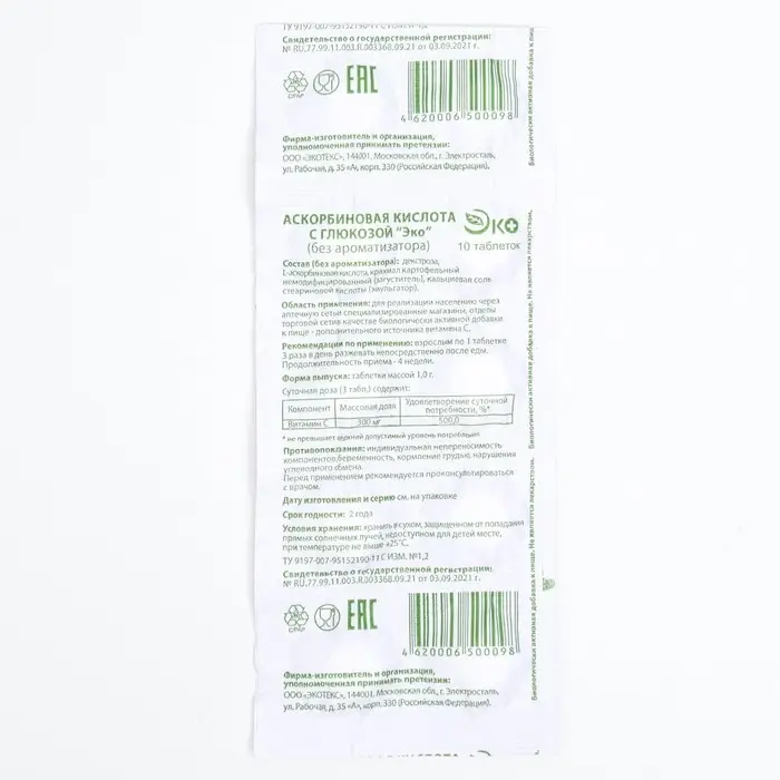 Аскорбиновая кислота с глюкозой Экотекс, 10 таблеток по 1 г