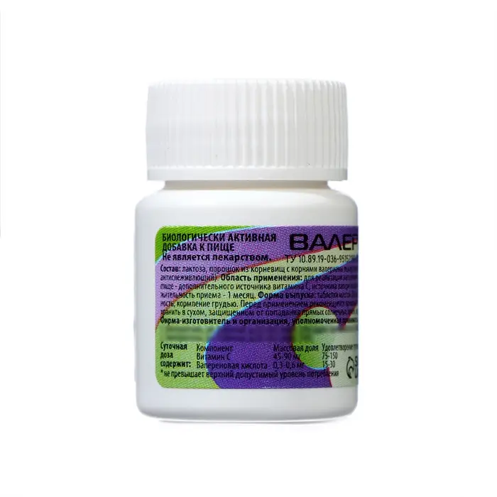 Состав: экстракт валерианы, лактоза, подсластитель E420, новитель E460i, агент антислеживающий E470, пиридоксина гидрохлорид (витамин B6).