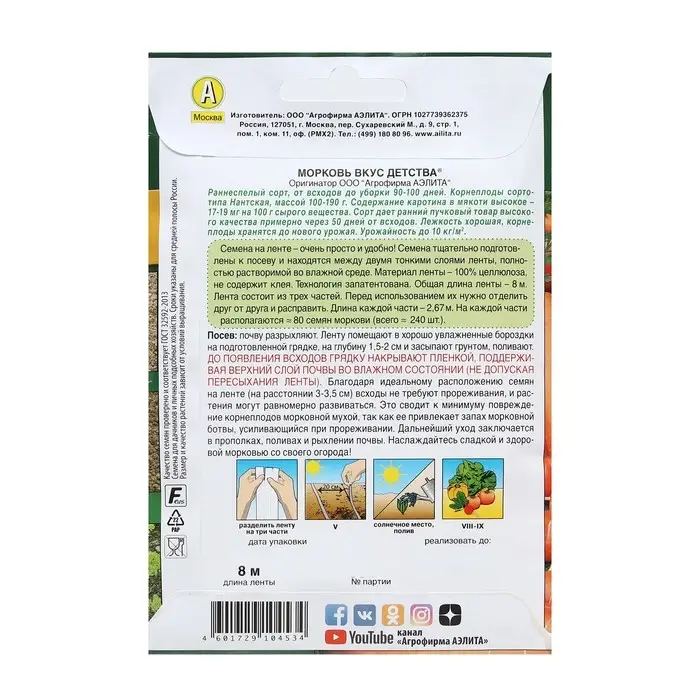 Семена на ленте – очень просто и удобно! Семена тщательно подготовлены к посеву и находятся между двумя тонкими слоями ленты, полностью растворимой во влажной среде. Материал ленты – 100% целлюлоза, не содержит клея. Технология запатентована. Общая длина ленты – 8 м. Лента состоит из трех частей. Перед использованием их нужно отделить друг от друга и расправить. Длина каждой части – 2,67 м. На каждой части располагаются ≈ 80 семян моркови (всего ≈ 240 шт.).