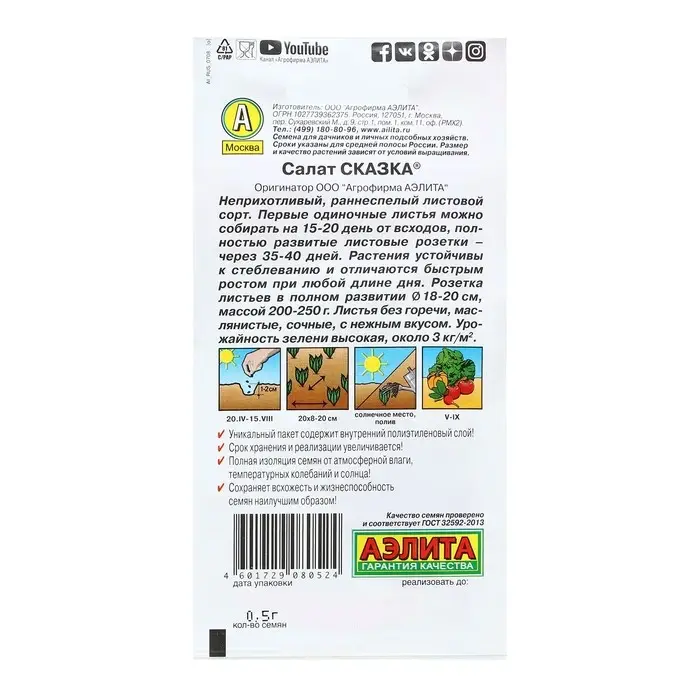 Раннеспелый листовой сорт (46-49 дней от полных всходов до технической спелости). Урожайность высокая, 2,7-3,2 кг/м2. Розетка листьев крупная, полуприподнятая, диаметром 18-20 см, массой 220-250 г. Листья без горечи, маслянистые, сочные, очень нежные на вкус. Сорт устойчив к стрелкованию и отличается быстрым ростом при любой длине дня.
