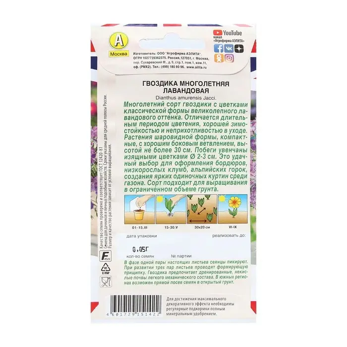Семена Цветов Гвоздика многолетняя лавандовая, 0,05 г