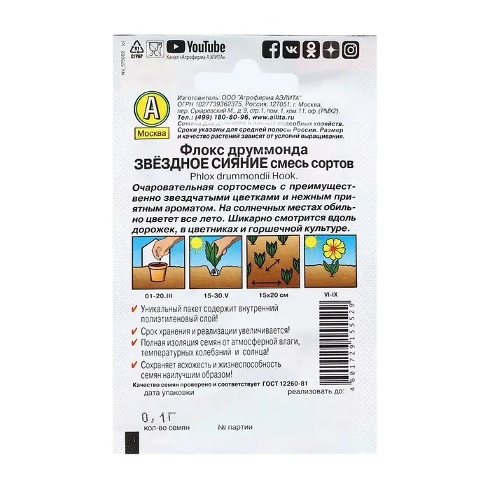 Семена цветов Флокс (Друммонда) "Звездный дождь", ц/п, 0,1 г