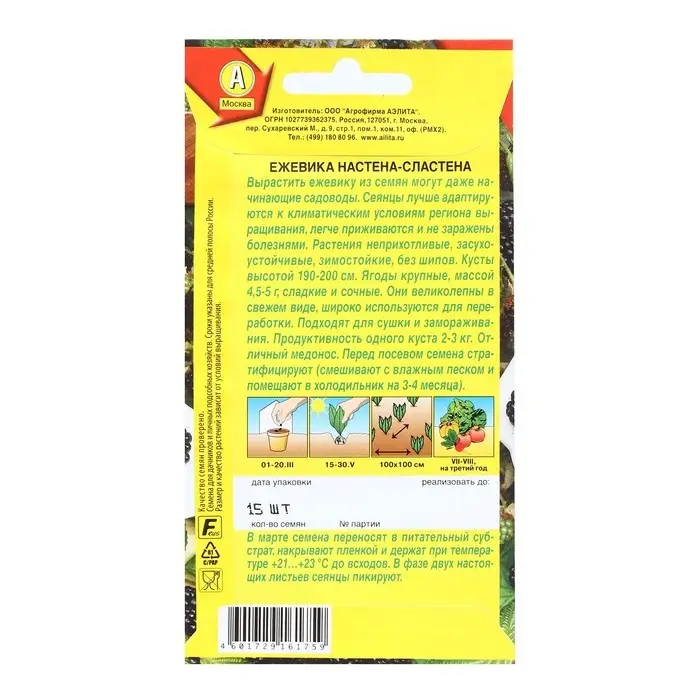 Вырастить ежевику из семян могут даже начинающие садоводы. Сеянцы лучше адаптируются к климатическим условиям региона выращивания, легче приживаются и не заражены болезнями. Растения неприхотливые, засухоустойчивые, зимостойкие, без шипов. Кусты высотой 190-200 см. Ягоды крупные, массой 4,5-5 г, сладкие и сочные. Они великолепны в свежем виде, широко используются для переработки. Подходят для сушки и замораживания. Продуктивность одного куста 2-3 кг. Отличный медонос. Перед посевом семена стратифицируют (смешивают с влажным песком и помещают в холодильник на 3-4 месяца).