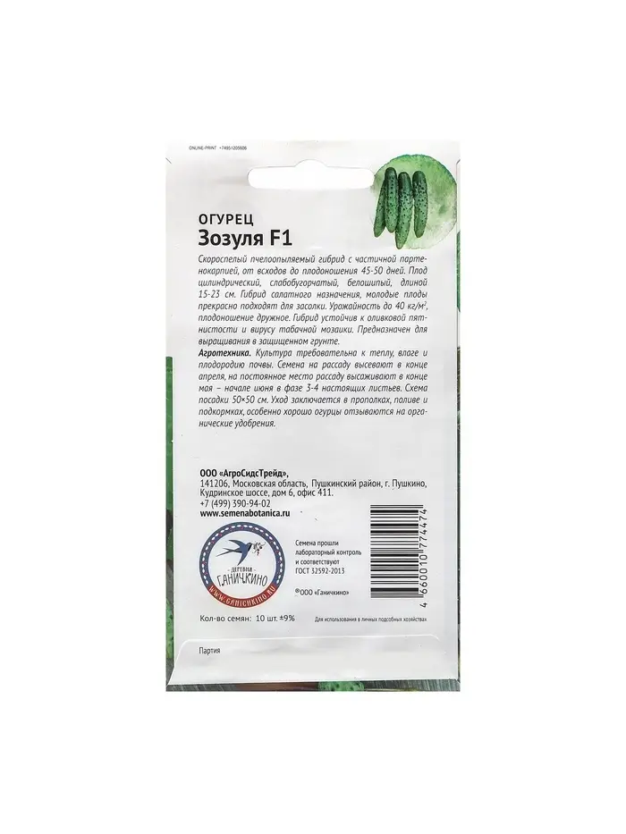Агротехника: Культура требовательна к теплу, влаге и плодородию почвы. Семена на рассаду высевают в конце апреля, на постоянное место рассаду высаживают в конце мая - начале июня в фазе 3-4 настоящих листьев. Схема посадки 50×50. Растения формируют путем прищипывания над третьим листом. Уход заключается в прополках, поливе и подкормках, особенно хорошо огурцы отзываются на органические удобрения.