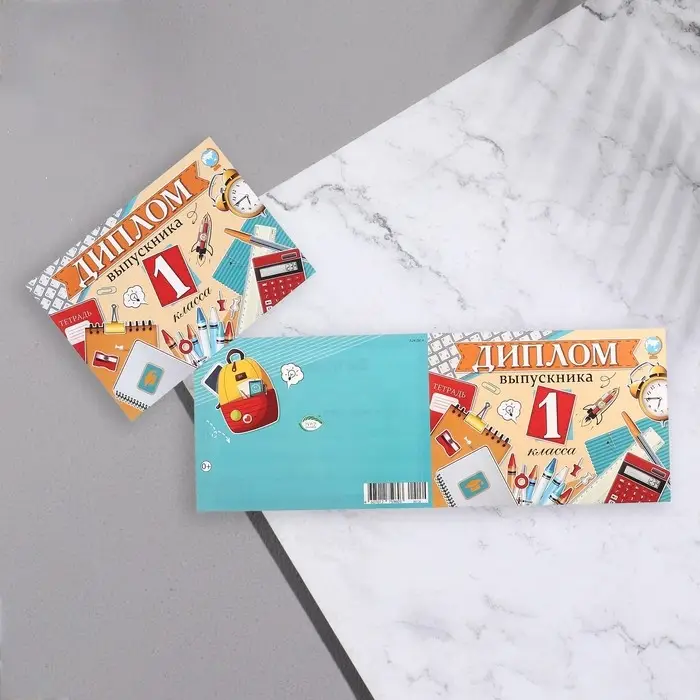 Диплом "Выпускника 1 класса" глиттер, школьная доска, портфель