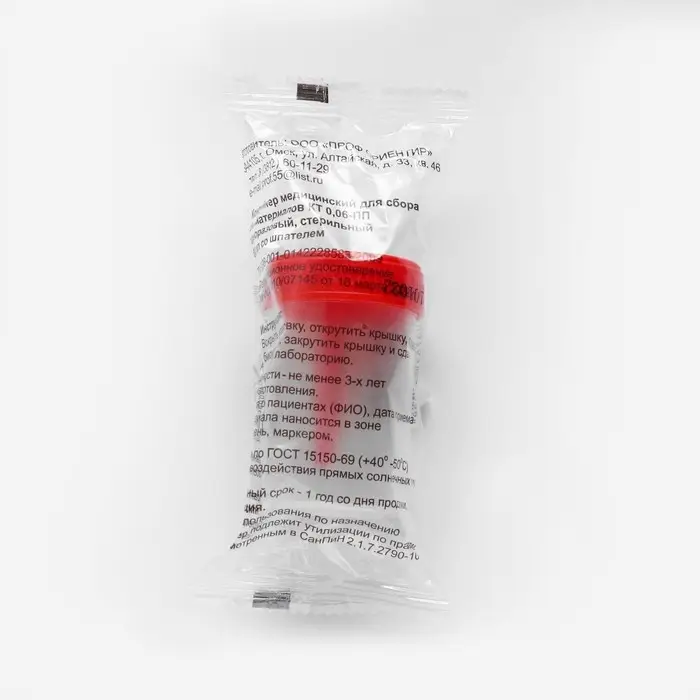 Стерильные контейнеры упакованы в индивидуальную упаковку, герметичный пакет, который снабжен насечкой, обеспечивающей быстрое вскрытие без использования ножниц. Стерилизован оксидом этилена.