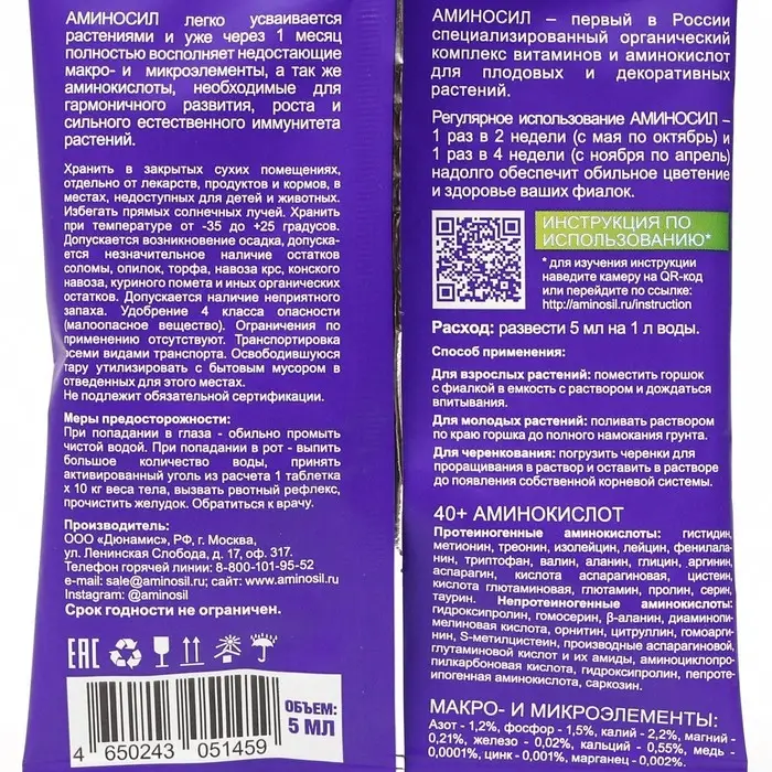 Витамины для фиалок Аминосил укрепляют растение, защищают корневую систему, формируют сильный естественный иммунитет, повышает стрессоустойчивость. Удобрение для фиалок - это специальный комплексный продукт, предназначенный для подкормки комнатных цветов. Данный вид удобрения содержит все необходимые элементы питания, которые необходимы для здорового роста и развития фиалок. Подкормка обладает высокой концентрацией макро- и микроэлементов, специально подобранных для обеспечения более интенсивного цветения и укрепления листьев. Удобрение для фиалок предназначено для использования в течение всего сезона и обеспечивает фиалки необходимым количеством питательных веществ. Регулярная подкормка помогает укрепить корневую систему, способствует более красивому и крепкому цветению и увеличивает продолжительность жизни растению.5 мл АМИНОСИЛ разбавить в 1 л воды до образования однородного раствора.Для взрослых растений:Вариант 1: поместить горшок с фиалкой в емкость в раствором и дождаться впитывания.Вариант 2: для молодых растений: поливать раствором по краю горшка.Регулярное использование АМИНОСИЛ надолго обеспечит здоровье ваших фиалок:В период с мая по октябрь - 1 р в 2 недели;В период с ноября по апрель - 1 р в месяц.Для черенкования:Погрузить черенки для проращивания в растворе оставить в растворе до появления собственной корневой системы для цветов.Бережный уход для нежных цветов;Содержит оптимальное количество калия и фосфора, необходимое для фиалок;Защита от температурный изменений, болезней и недостатка солнечного света;Подходит для регулярной подкормки и для черенкования.