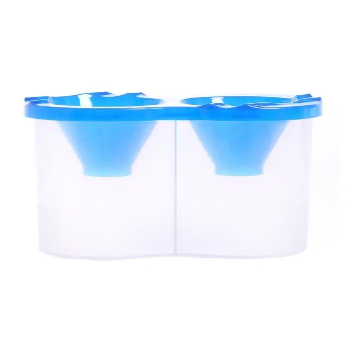 Имеет 2 вместительных резервуара для воды. Специальная форма крышки стакана исключает возможность вытекания воды. Линия на прозрачном корпусе указывает на максимально возможный уровень наполнения. Выполнен из прочного пластика. Имеются специальные углубления на крышке для размещения кисточек. Полный объем одного отделения - 150 мл. Объем до уровня - 50 мл.