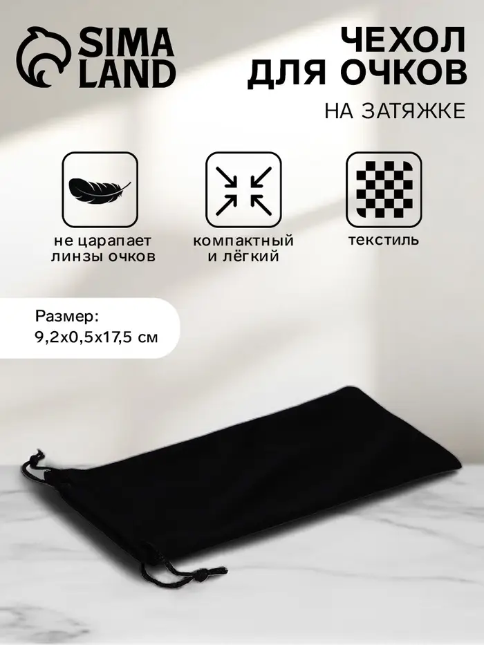 Чехол для очков — элегантное и практичное решение для защиты ваших очков. Лаконичный чёрный цвет и длина 17,5 см делают его универсальным аксессуаром, который легко поместится в вашей сумке. Чехол выполнен из текстиля с плотностью 230 г/м², что обеспечивает надежную защиту без утяжеления. Простая застежка на затяжке гарантирует легкость и удобство использования. Подходит для женщин, которые ценят стиль и функциональность.