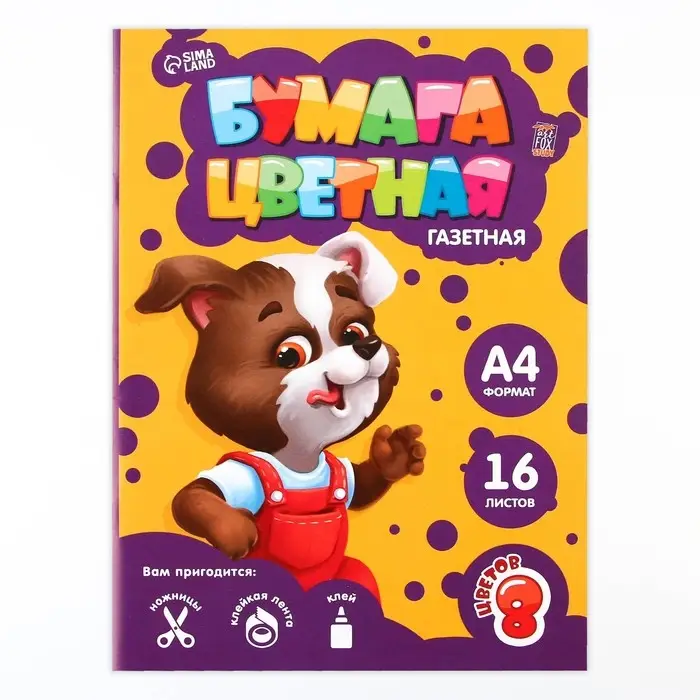 Бумага цветная односторонняя А4 «Пёсик» 16 листов 8 цветов газетная, плотность 45 г/м², плотность 80 г/м²
