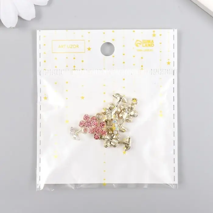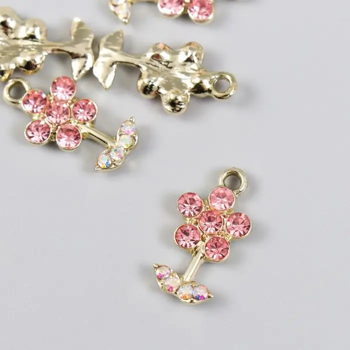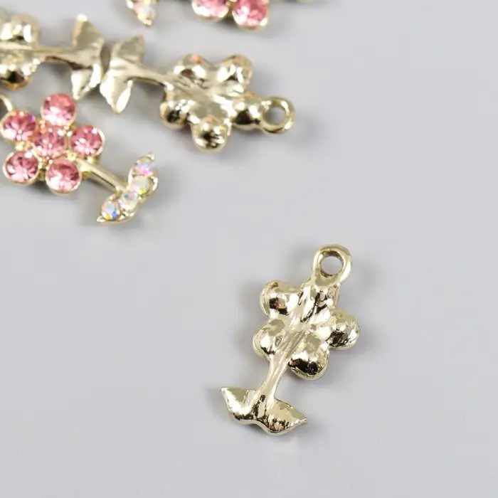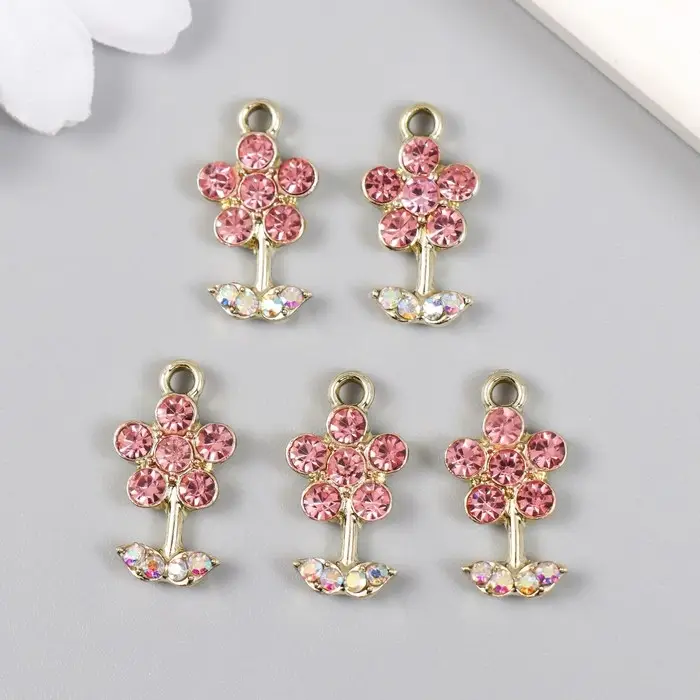 Декор для творчества металл, стразы "Цветочек розовый с листиками" золото 1,1х2 см
