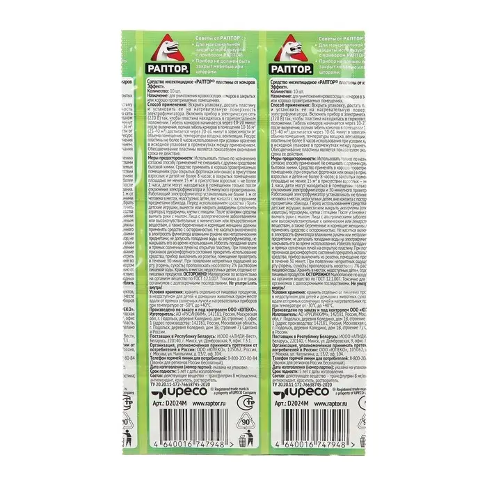 Пластины «Раптор» обеспечивают 100% уничтожение комаров в помещении. Для использования достаточно вставить пластину в гнездо фумигатора. При нагревании средство начинает постепенно испаряться, что обеспечивает равномерность распространения действующего вещества в воздух. Препарат уничтожает как уже находящихся в помещении особей, так и вновь залетающих насекомых. Пластина начинает действовать всего через 10-15 минут после включения прибора.В состав входит высокоэффективное японское действующее вещество. etoc® (эток) – 9 мг/пластину, синергист – 30 мг/пластину, краситель, отдушка, стабилизатор, растворительДля использования достаточно вставить пластину в гнездо фумигатора. При нагревании средство начинает постепенно испаряться, что обеспечивает равномерность распространения действующего вещества в воздух. Препарат уничтожает как уже находящихся в помещении особей, так и вновь залетающих насекомых.