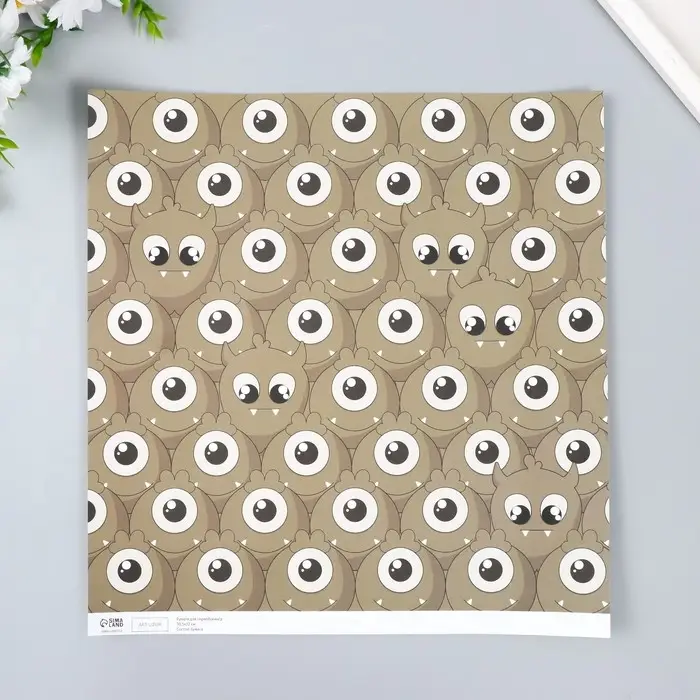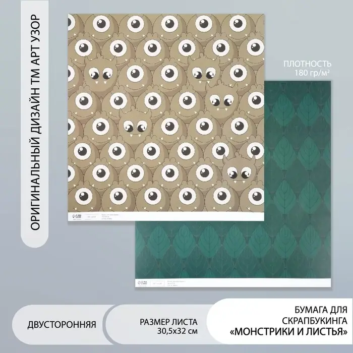 Бумага для скрапбукинга двусторонняя "Монстрики и листья" плотность 180 гр 30,5х32 см