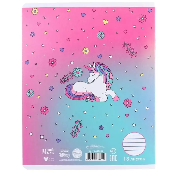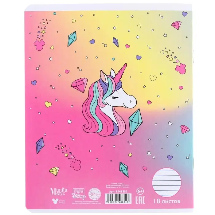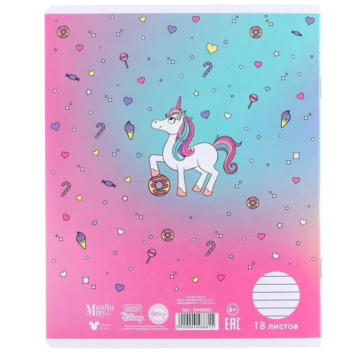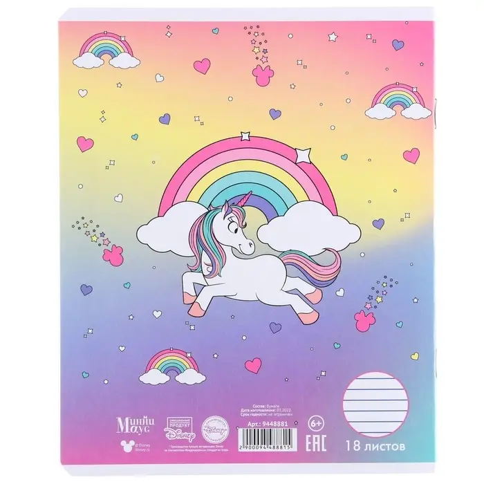 Тетрадь в линейку 18 листов, 5 видов МИКС, обложка мелованный картон, «Минни Маус и единорог»