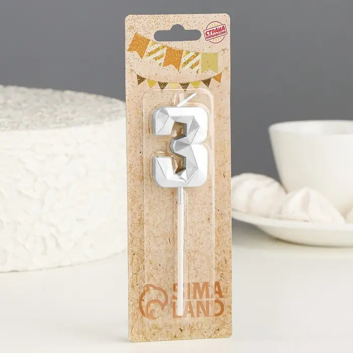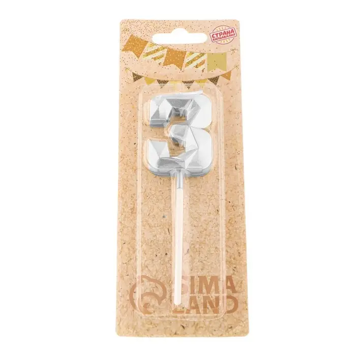 Свеча в торт на шпажке «Алмаз», цифра 3, серебряная, 5×2.6 см