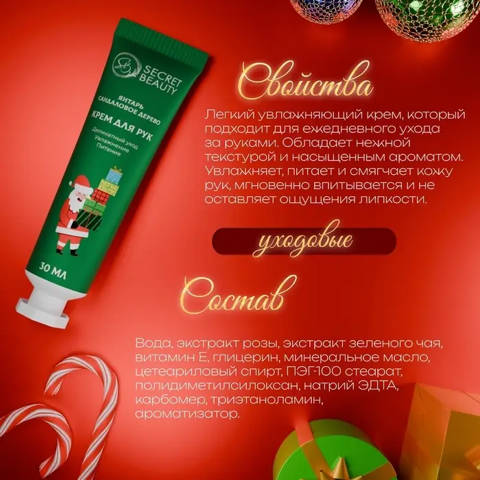 Крем для рук новогодний «Янтарь и сандаловое дерево», 30 мл — это замечательный новогодний подарок, который сочетает в себе утонченный аромат и уход за кожей. Этот крем быстро впитывается, увлажняя и питая кожу, оставляя её мягкой и нежной на ощупь. Уникальная комбинация ароматов янтаря и сандалового дерева создаёт атмосферу уюта и тепла, идеально подходящую для зимнего времени года.