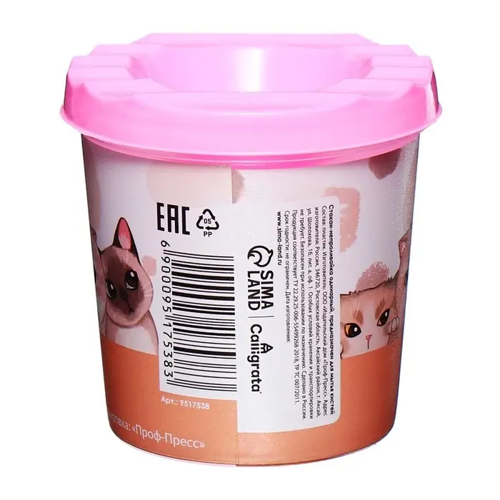 Специальная форма крышки стакана исключает возможность вытекания воды. Линия на прозрачном корпусе указывает на максимально возможный уровень наполнения. Выполнен из прочного пластика. Имеются специальные углубления на крышке для размещения кисточек. Полный объем - 210 мл. Объем до уровня - 75 мл. Оригинальный дизайн сделает процесс рисования еще более увлекательным