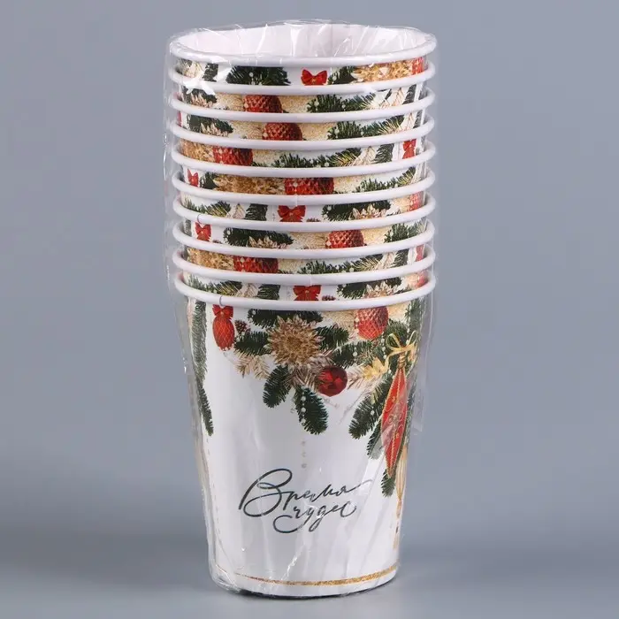 Стакан украшен ярким и красочным изображением новогодней тематики, которое создаёт ощущение праздника и радости. Идеально подходят для использования на детских праздниках, корпоративных мероприятиях, семейных торжествах и на многих других событиях. Они станут прекрасным выбором для тех, кто ценит качество, экологичность и стиль.