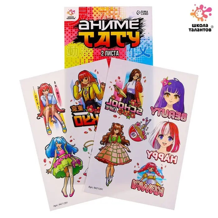С набором детских тату из серии «Аниме» каждый юный фанат аниме-культуры сможет с помощью временных татуировок украсить не только себя, но и обложку тетради или мебель.