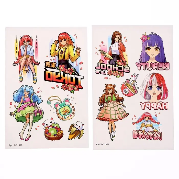 В комплекте 2 листа тату с кавайными аниме-персонажами.