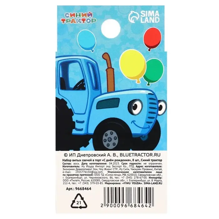 Свечи для торта витые «С Днем Рождения», 8 штук, Синий трактор