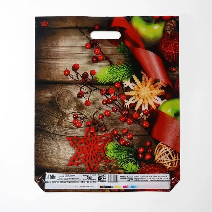 Однако, самое главное в этом пакете – это его уникальный дизайн. Выполненный в традиционных новогодних цветах, он украшен яркими рисунками снежинок, елочных игрушек и других символов Нового года.