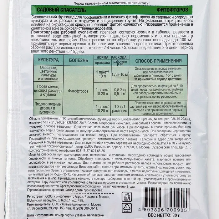 Биологический фунгицид для профилактики и лечения фитофтороза на садовых и огородных культурах и их рассаде в открытом и защищенном грунте.